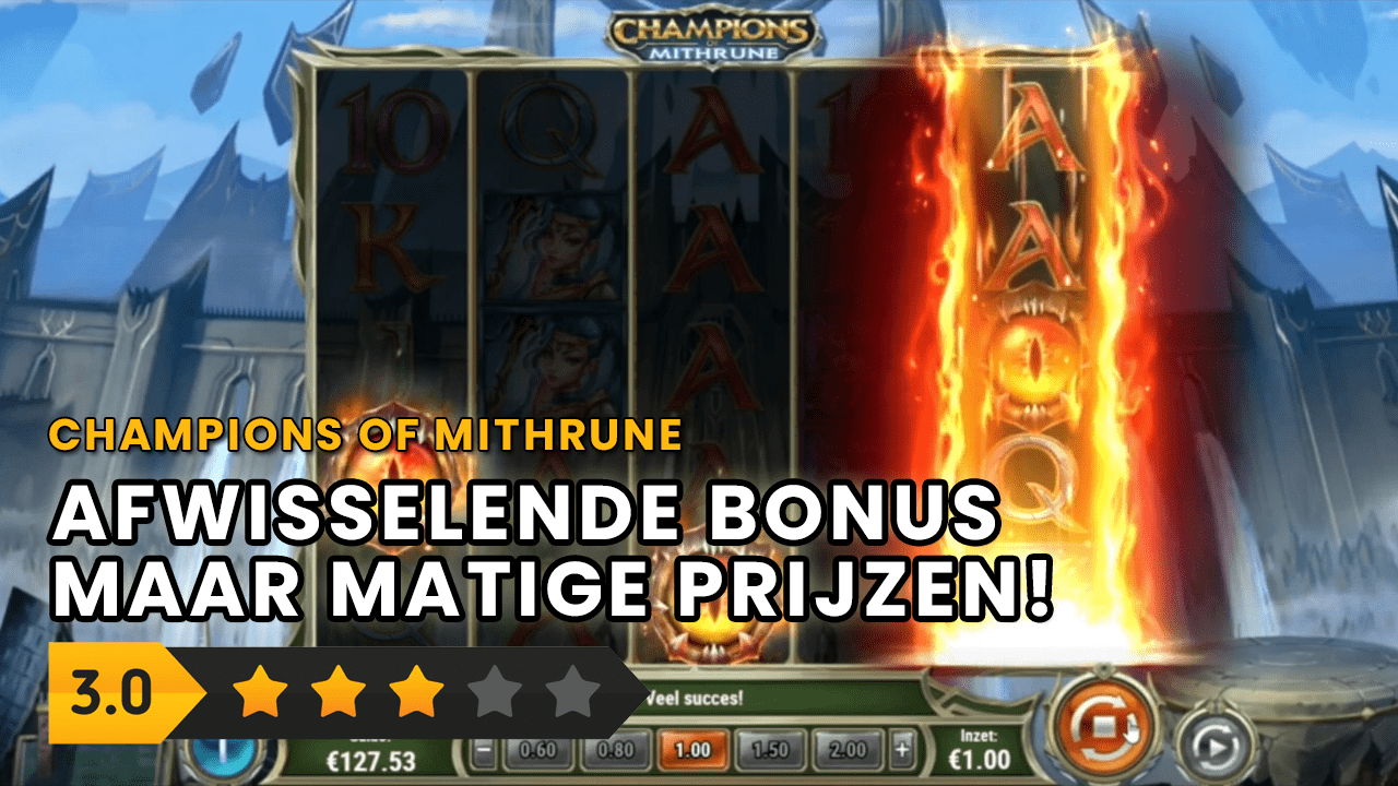 Maar, en ja, er is altijd een maar… het is extreem lastig om met deze gokkast grote prijzen te winnen. Wil je daar kans op maken dan zal je echt alle features vrij moeten spelen in de pre-bonus, iets wat mij na honderden keren proberen nog steeds niet gelukt is. En ja, ik heb best een paar leuke bonussen gehad, maar over het algemeen valt de uiteindelijke winst vaak tegen. Maar goed, Champions of Mithrune levert wel het nodige spelplezier op, en met name de free spins bonus is zeker de moeite van het proberen en aanschouwen waard.